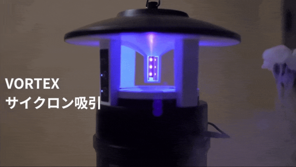 395nmの波長のUVライトで蚊を引き寄せ、サイクロン式の吸引が吸い込み捕獲。海外で特許を取得した脱走防止構造で、本体下に捕獲した蚊を逃がさないという。