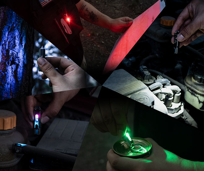 「HUNT XR」は、白・赤・緑・青・UVの5色を状況に応じて使い分けられる。白は明るさを4段階、赤は2段階で調整可能。さらにSOSモードとビーコンモードも搭載している。
