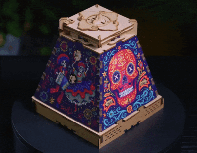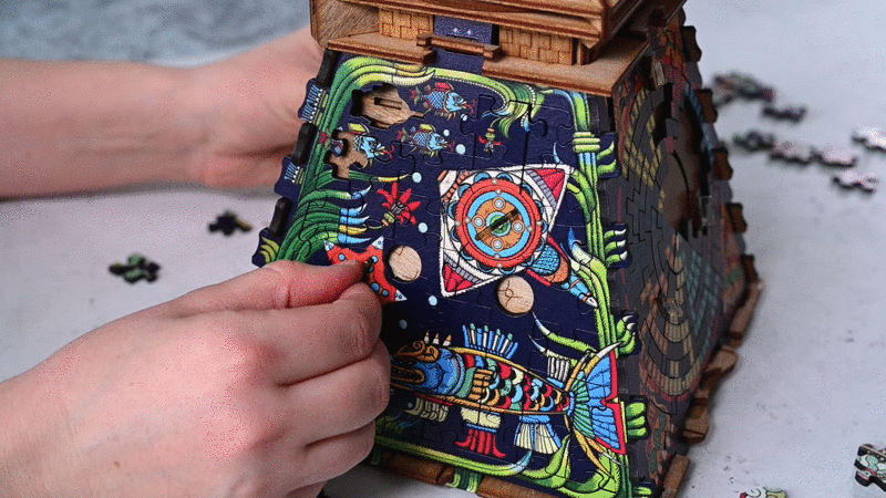 本体は木製の立体パズルで、4面にアートと仕掛けがある。200ピース以上あるジグゾーパズルを完成させると隠されたヒントが出てきて、パーツを動かして仕掛けを解くと鍵を開けられる。