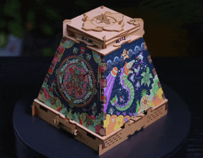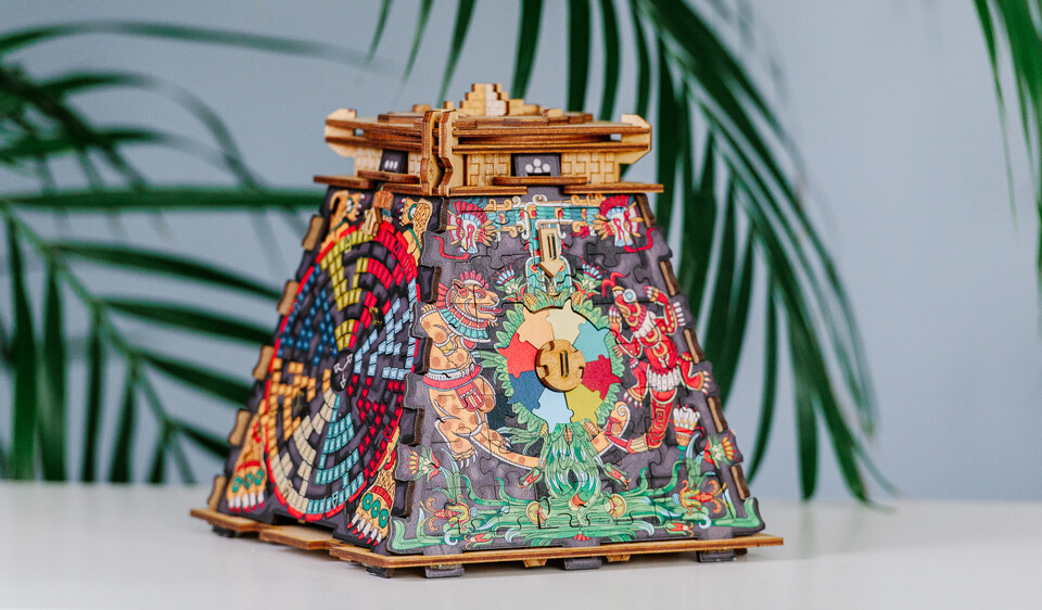 「太陽のピラミッド」は、古代のピラミッドの謎をモチーフにした木製の謎解きパズルボックス。カラフルなアートと仕掛けが楽しめる。