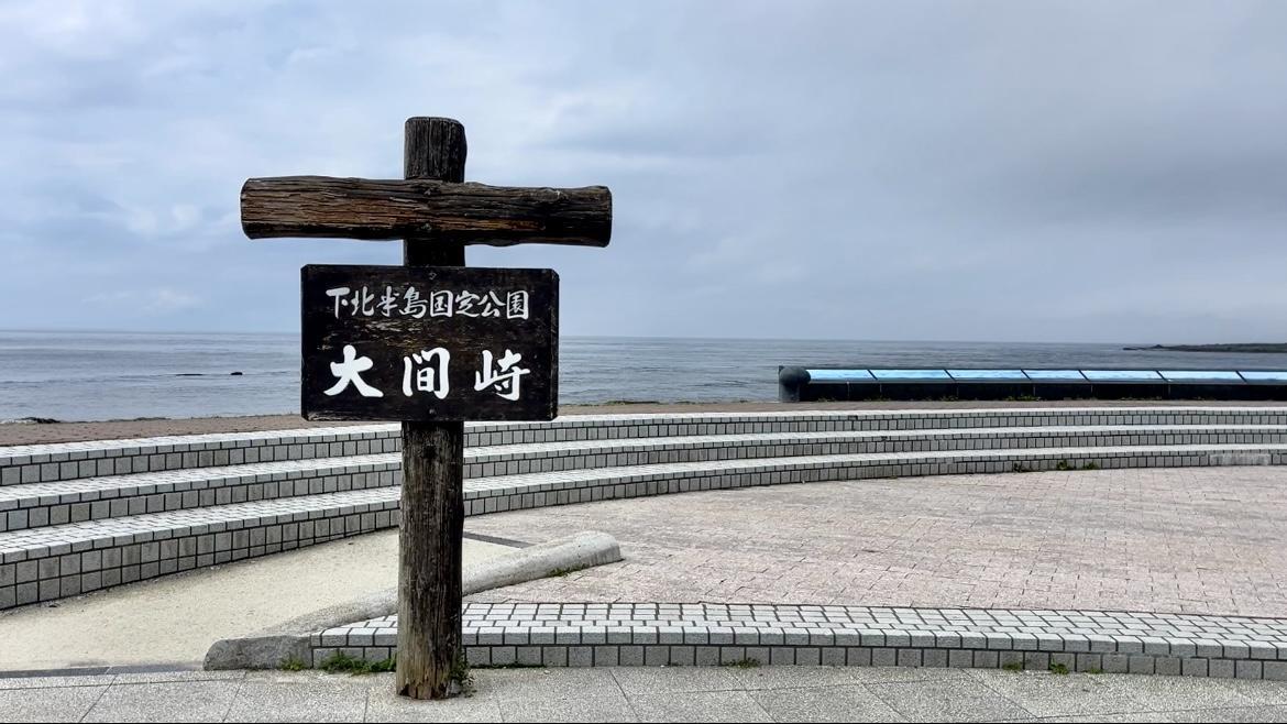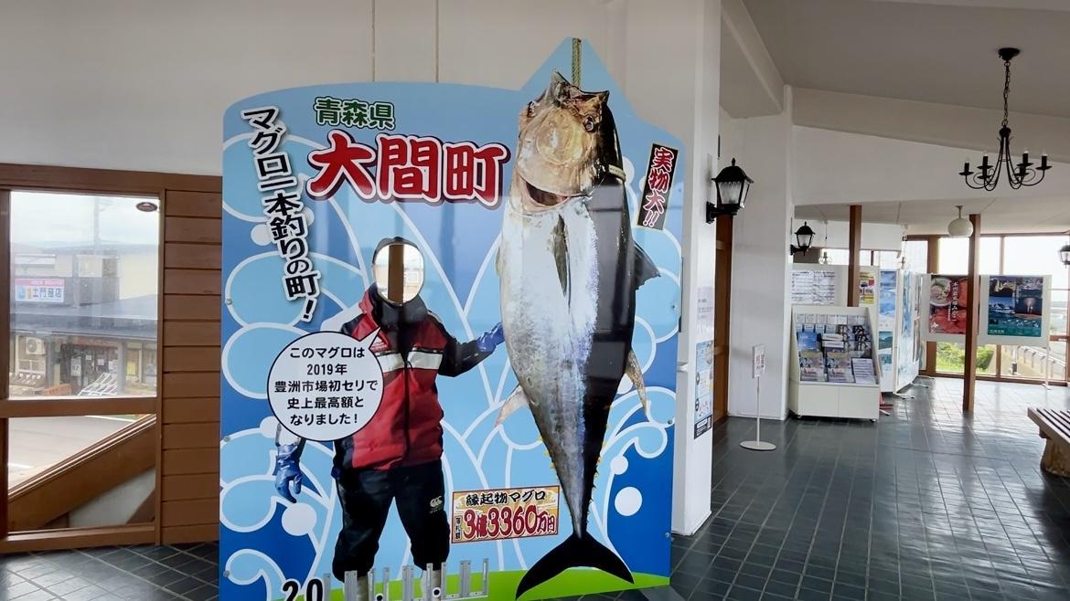大間崎付近は一大観光地で、「こヽ本州最北端の地」碑と「まぐろ一本釣の町おおま石像」は、人気の記念撮影スポット。隣接するレストハウスには、2019年に豊洲市場で3億3360万円で落札された「縁起物マグロ」の顔出し看板が、津軽海峡を見下ろすように据えられている。