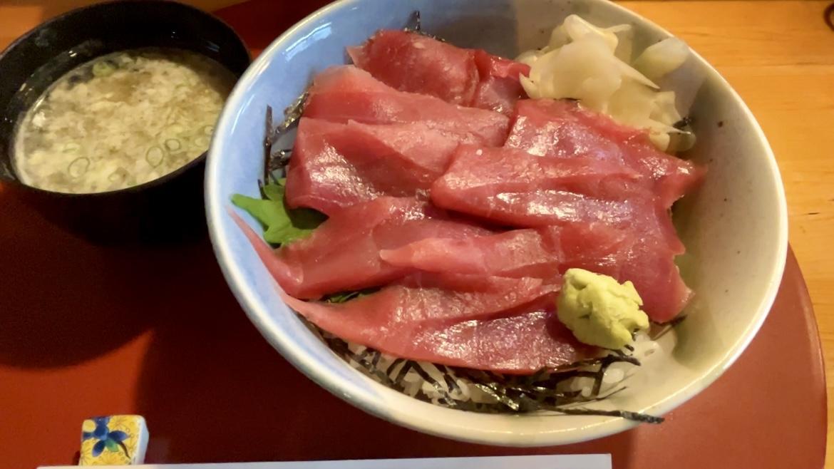 町中には大間のマグロを味わえる飲食店も多く、漁港に近い「浜寿司」にて、マグロ丼をいただくことに。「大間まぐろ」の赤身が酢飯の上を埋め尽くさんばかりの量で、柔らかくみずみずしく実に芳醇な味わい。