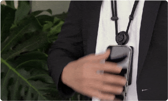 ストラップの吊り下げパーツには、マグネット式のスライドバックルを採用。スマホにスライドフックパーツをセットすれば、ワンタッチでスマホも吊り下げられる。片手で装着できるので、急きょ両手を空けたい時などに便利だという。