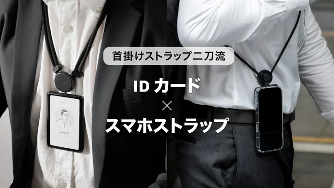 「首掛けストラップ二刀流」は、スマホストラップとICカードホルダーを組み合わせたネックストラップ。