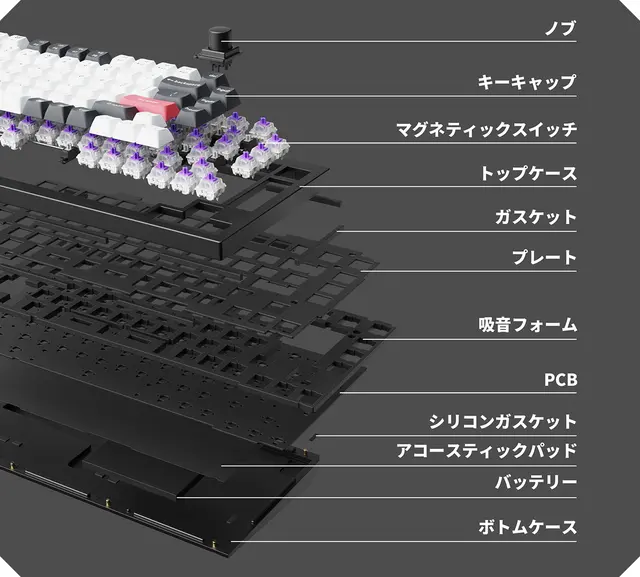 キーボードの応答速度を向上させるラピッドトリガーモード搭載。従来のキーボードのようにスイッチのリセットポイント(ボタンが押されたと判定されるポイント)が固定されず、「押し込む瞬間にON/押し上げた瞬間にOFF」となる。