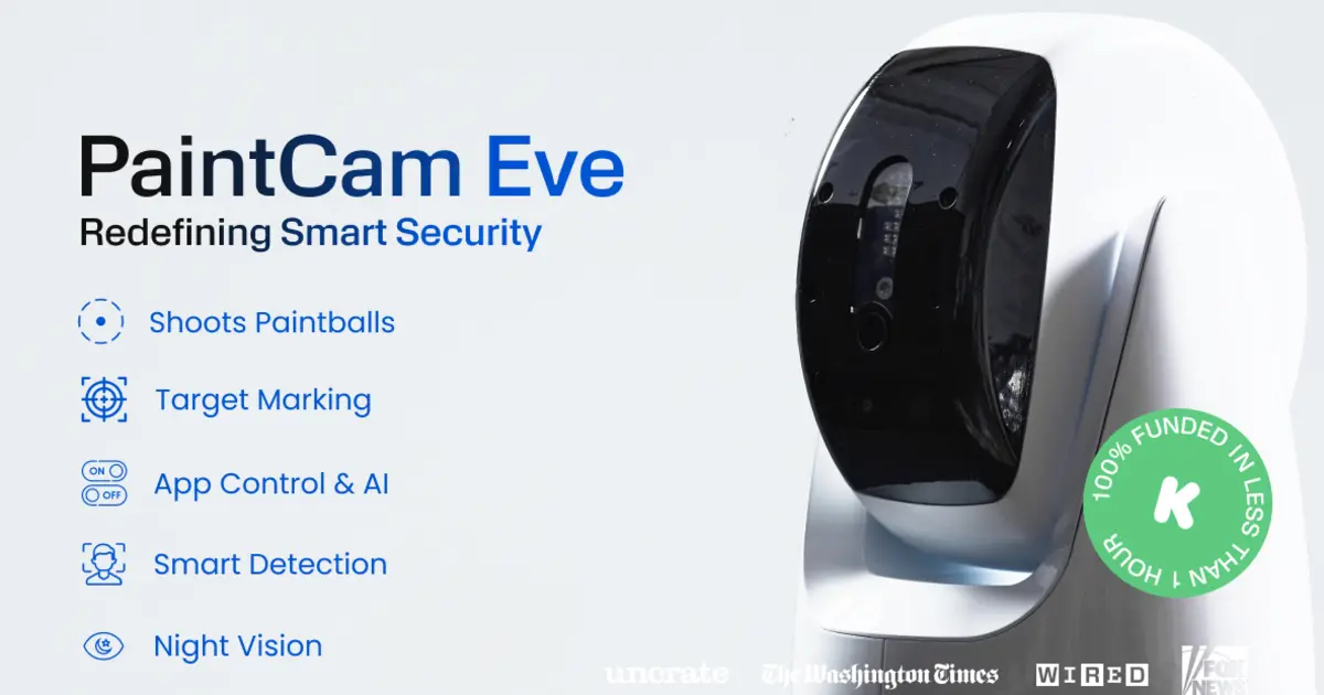 「Eve Paintcam」は侵入者を検知すると、音声で警告する防犯カメラ。そのまま侵入者が立ち去らなければ、カラーボールを発射。侵入者の検知は、スマホなどのデバイスに通知される。