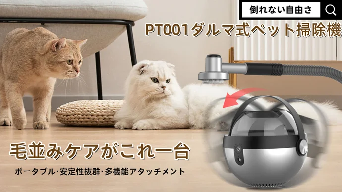 ペットのお手入れに特化! あらゆる場所の毛を掃除する「PT001ダルマ式コードレスペット掃除機」