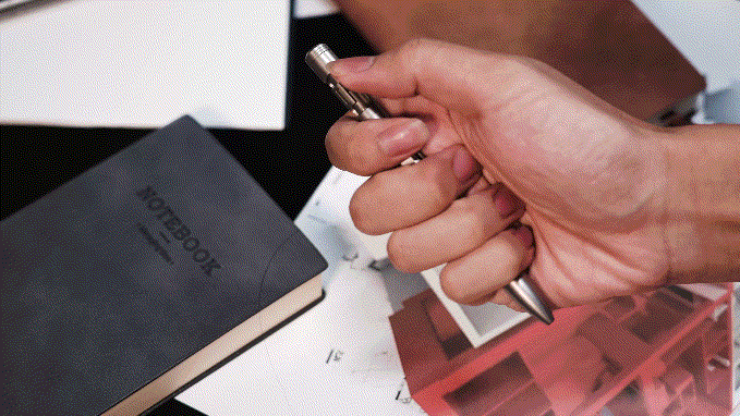 ペンの中央には溝があり、溝に突起を入れることで、ペン先の出し入れやタングステン鋼の出し入れをする。このアクションが考え事をしている時のちょっとした手遊びになる。また、ペン全体にはさまざまな溝がデザインされていて、滑り止めの役割を果たしている。