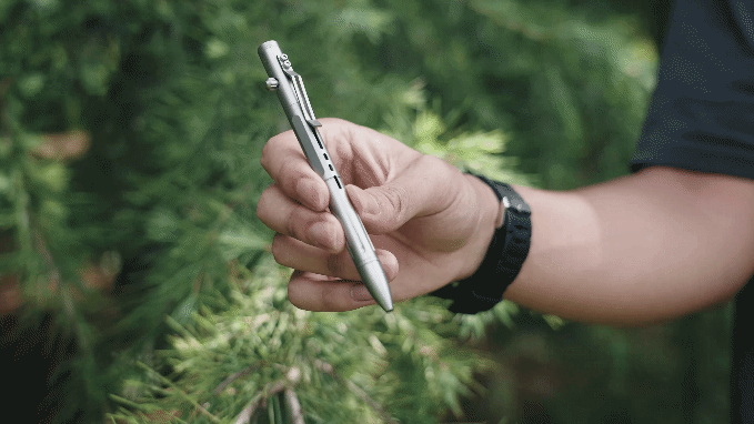 「Titanium Bolt Pen」は、ペンの上部に小さく丸い金属が付いているチタン製のボールペン。頑丈で耐久性なチタンによって、いざという時に窓ガラスなどを破壊できる。