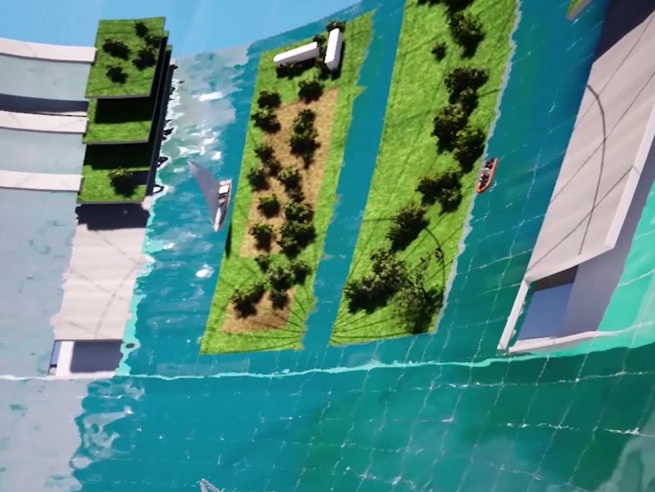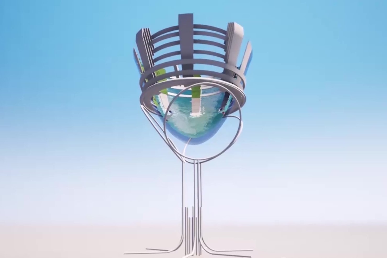 海に浮かぶ島のような写真は構造物内部のイメージ図。コップの内側のようになっていて、側面に広場や、人が住む建物があるつくりだ。