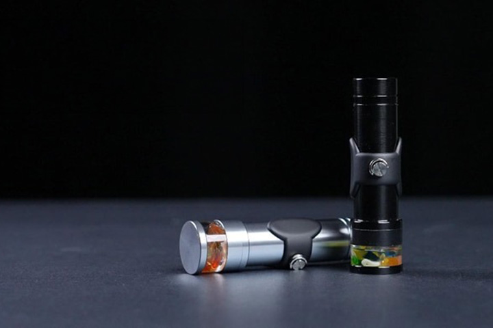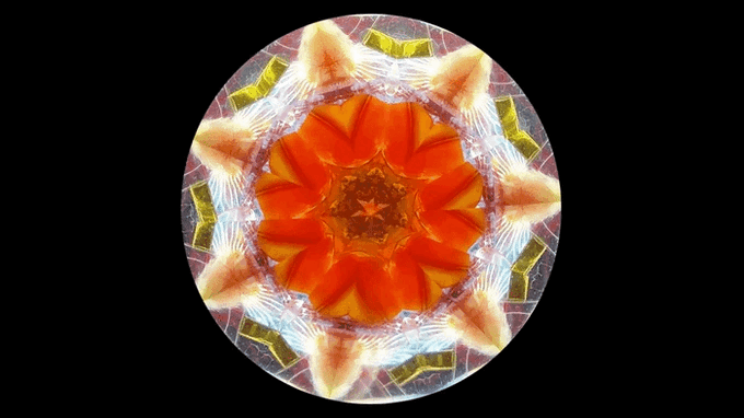 模様の元となる先端部のセルには液体と大小さまざまなオブジェクトが収められている。色とりどりのオブジェクトは、液体の中でゆっくりと移動しながら筒の中で無限の模様を描く。