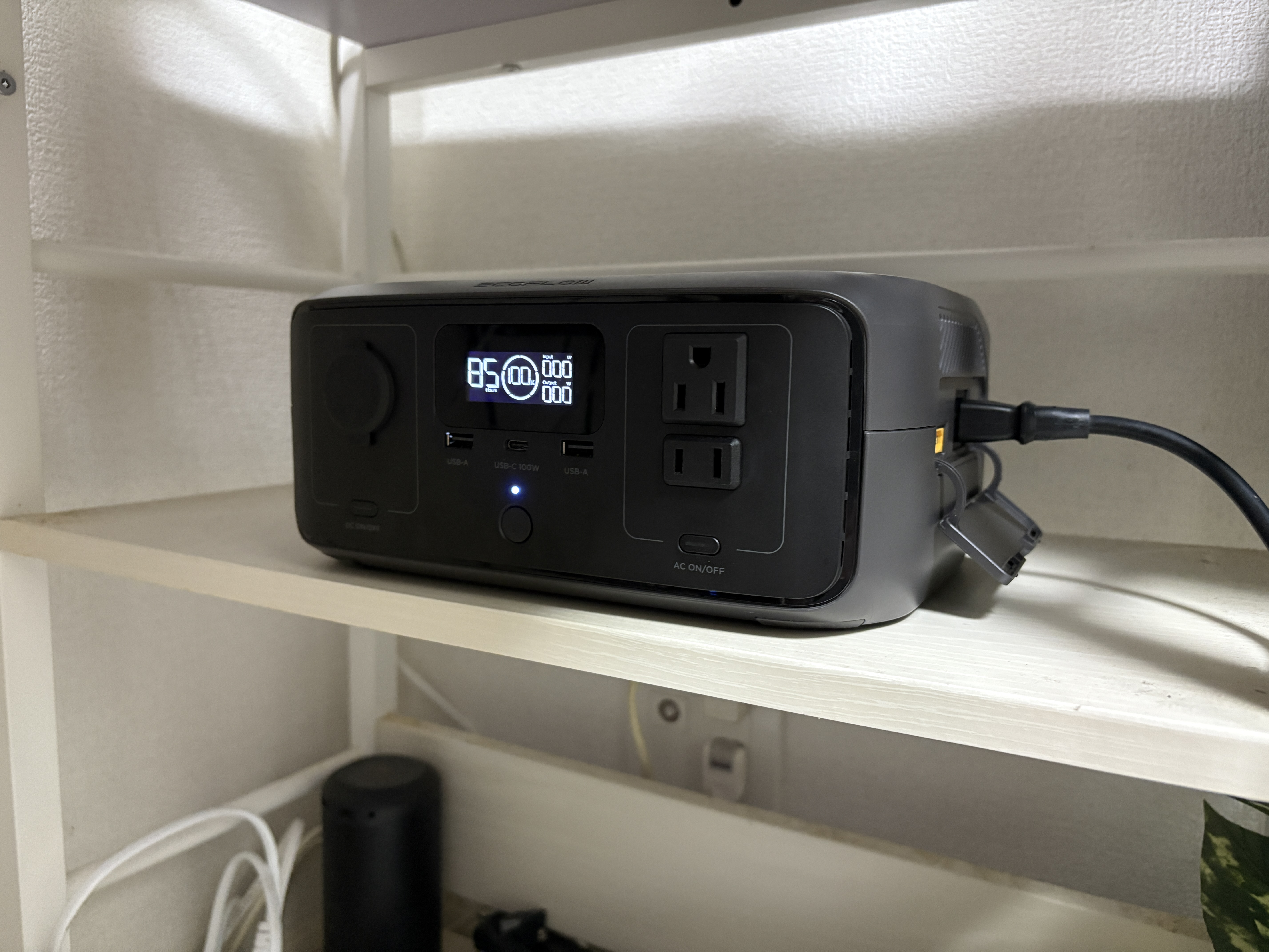 バッテリー容量は245Whで出力は最大300W。大型のポータブル電源に比べると容量は少ないですが、満充電でスマホ充電を14時間できるので備えには十分です。出力ももっと出るものもありますが、外で冷蔵庫や電気ストーブなどを使う用途ではないので最大300Wあれば十分かなと思いました。
