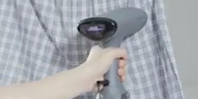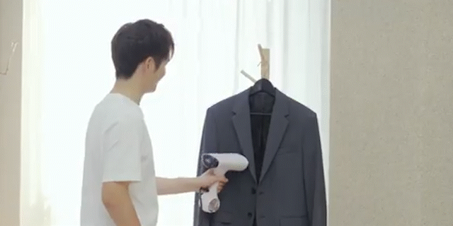 「Morus V6」は、衣類に吸い付き、スチームをかけながらシワを伸ばせる。ピタッと衣類に吸着するため、ハンガーにかけたままでも操作が可能だ。