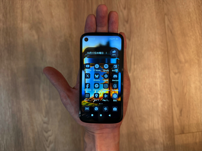 小さいといっても十分なバッテリーを搭載するという都合上、厚みはそれなりだ。重量も180グラムあり、サイズの割にズッシリ感がある。背面にはカメラと指紋センサーを搭載。OSはAndroid 14。ほか、NFC、デュアルSIMスロット(microSD対応)など。FeliCaは搭載しない。