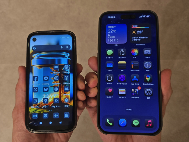 Jelly MaxとiPhone 16 Pro Maxを比べると、大きさの差は歴然だ。現在スマホの主流は6台インチ半ば〜後半で、折りたたみを含めどんどん大型化が進んでいる。