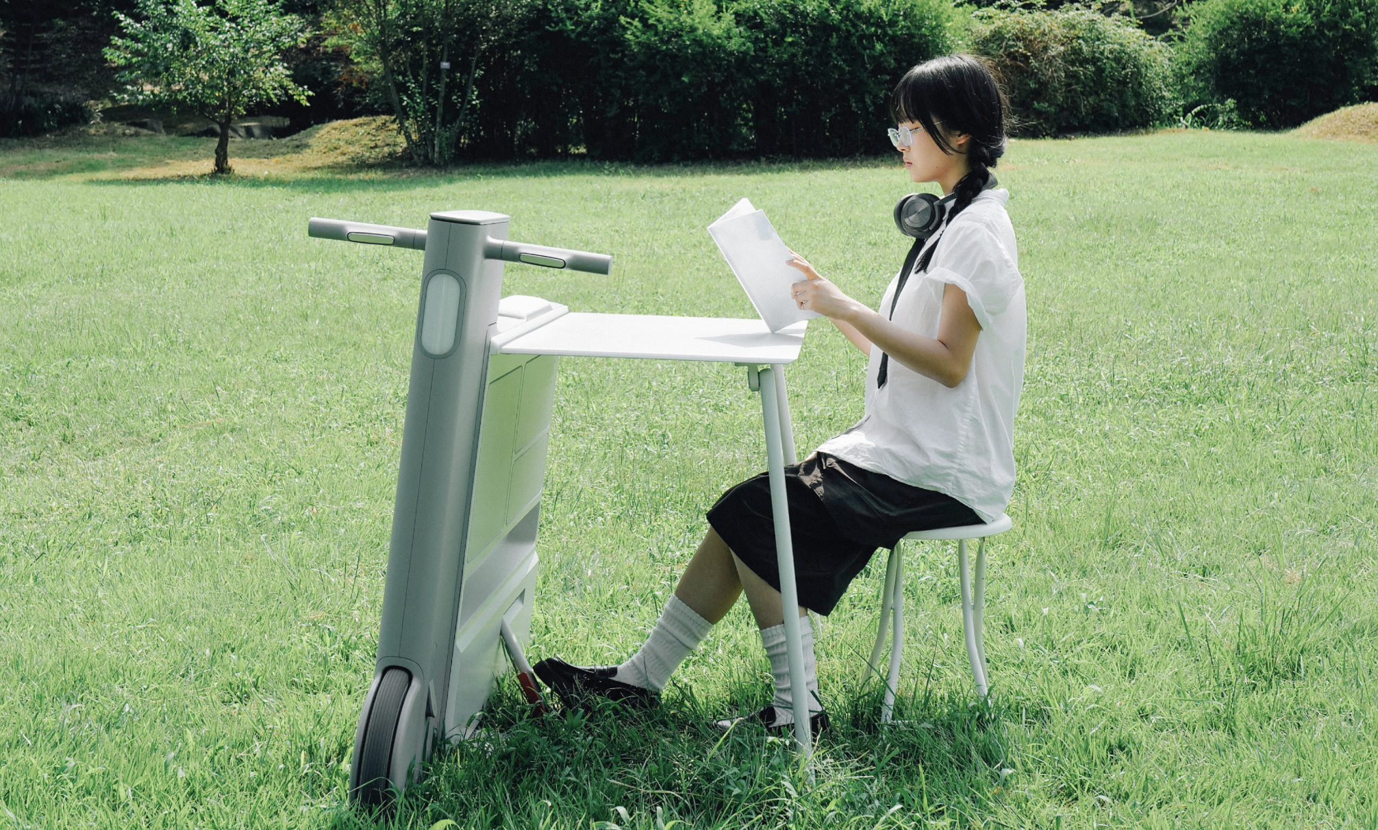 「Worknic」は、バイクのようなデザイン。「Worknic」に乗って移動もできるそうだ。車輪にはストッパーが付いているので駐車できる。さらに、デスク、デスク脚、イスを内蔵し、引き出して展開するだけで作業環境が整う。