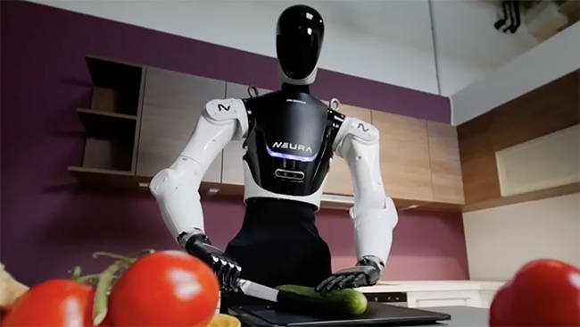 「4NE-1」はドイツのNEURA Roboticsが開発中のヒューマノイドロボット。スキル学習によって様々な作業ができ、公開された動画ではアイロン掛けや調理などを行っている様子が確認できる。