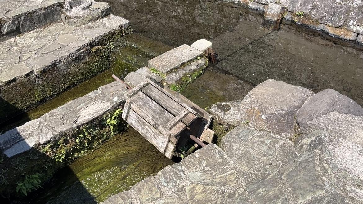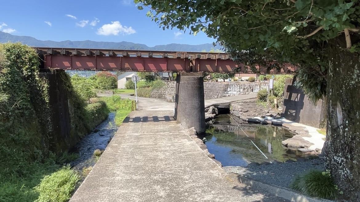 駅の近くにある寺坂水源は、南阿蘇鉄道の鉄橋の直下から湧き出している。底から水が吹き出す池のそばには、芋の皮むきに使う「芋車」が設置。定期的に水源と洗い場の清掃も行われるなど、地域に親しまれてきた湧水である。