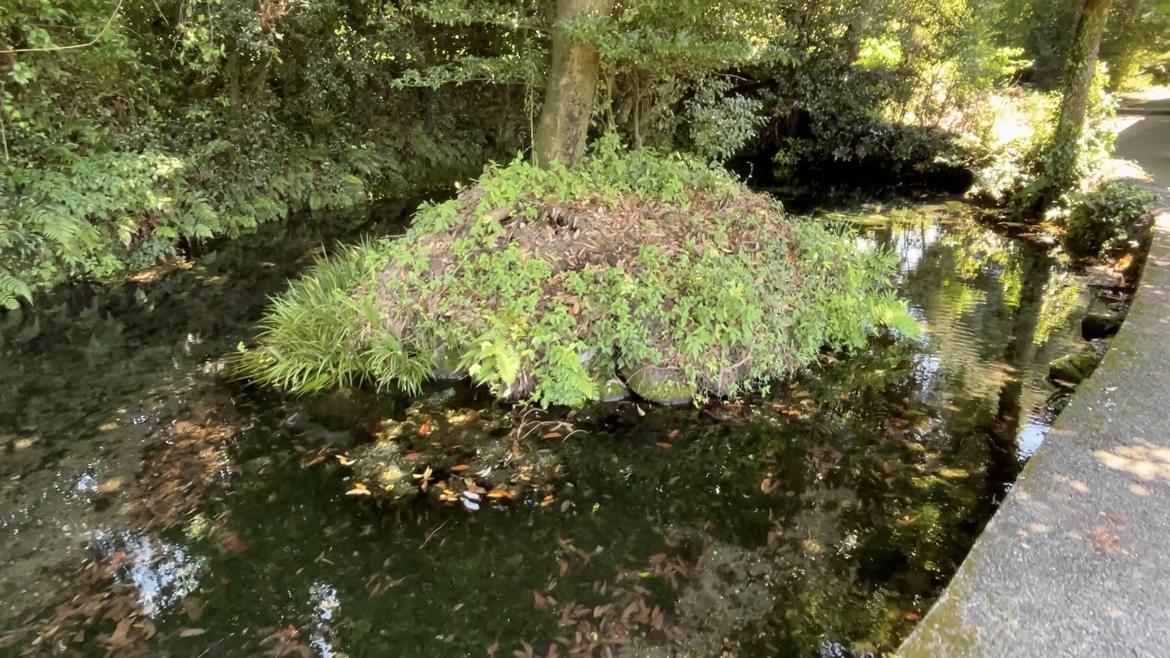 隣の中松駅まで歩いていく途中、駅の手前には、岩下神社の参道沿いに湧く、池の川水源がある。池の中央にある兜石(かぶといし)は、農作物の出来を占ってくれる岩。見えなくなるほどの水量がある年は雨が多く凶作に、石がしっかり露出している年は晴天が多く、豊作になると伝えられている。うっそうとした樹木に囲まれた、神秘的な雰囲気の水源だ。