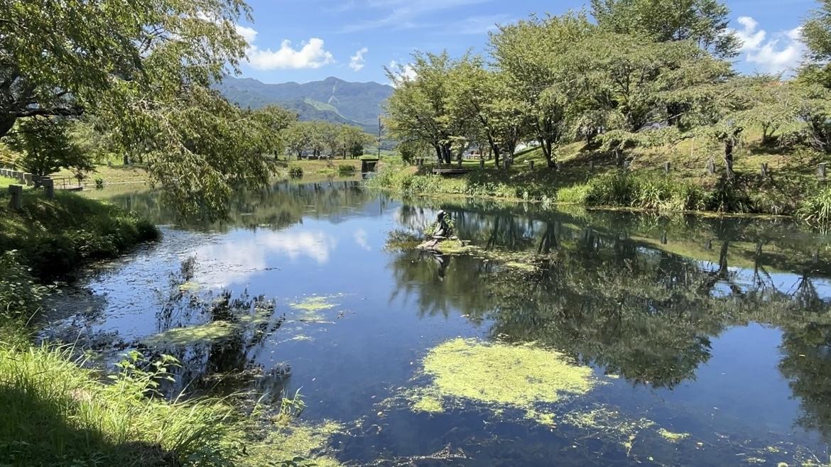 伝説によると、池には仲の良い男女のカッパが住んでいて、いたずら好きな男のカッパが神様に追放され、今も女のカッパが帰りを待っているという。池には女のカッパの像も立っており、透明度が高い水面には、阿蘇外輪山が逆さに映る景観が神秘的だ。