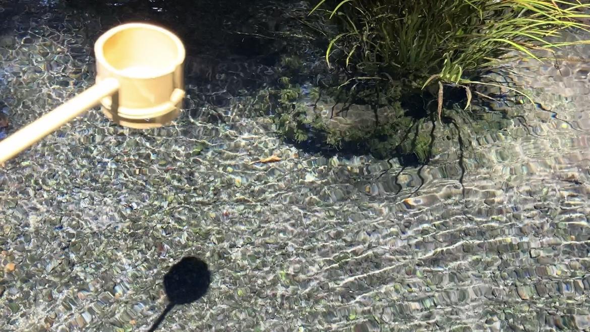 境内のそばに湧水地が広がり、澄みきった水の先に見通せる池の底からは、砂を噴き上げながらこんこんと水が湧きだしている。