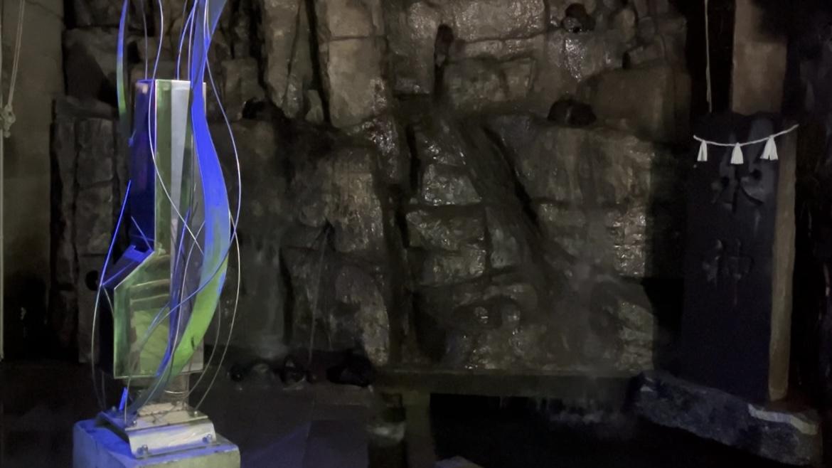 最奥は掘り残された岩盤をイメージした壁面から、水がごうごうと滝のように流れ落ち、脇には湧水を守るように、水神の碑も立っている。