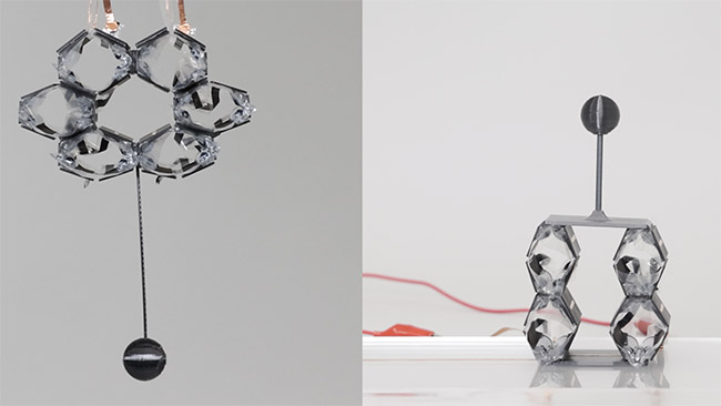 「HASELS」はグラスファイバープレートを六角柱に組んだ構造で、内側に静電アクチュエータの人工筋肉を搭載。高速で伸縮することで、ジャンプしたり這って移動したりできる。