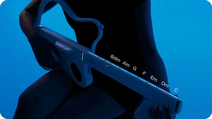 タッチ式のネックには複数のコード(和音)が割り当てられている。それぞれのゾーンを押さえながら、ボディ中央のパッドをタップすれば、対応したコード音を演奏する。