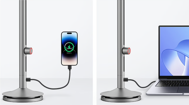 スタンド下部には45W出力のUSB Type-Cポートを搭載。スマホやタブレットなどの急速充電に対応している。電源アダプターは、コンセントの他の差し込み口を塞がないよう、プラグが4方向に回転する仕様。また、2〜3個の照明が付けられる55Wアダプターと、4〜5個用の105Wアダプターを選択できる。