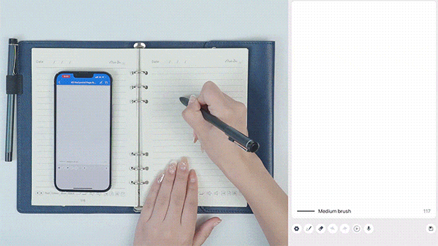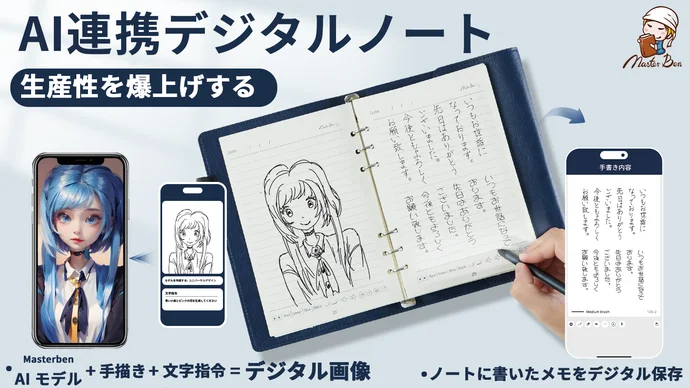 「Masterben 3」は専用の紙とペンを使い、手書きの内容をスマホに直接デジタル表示できるデジタル手帳。AI画像生成機能も備え、描いたイラストを異なるタッチの画像に変換できる。