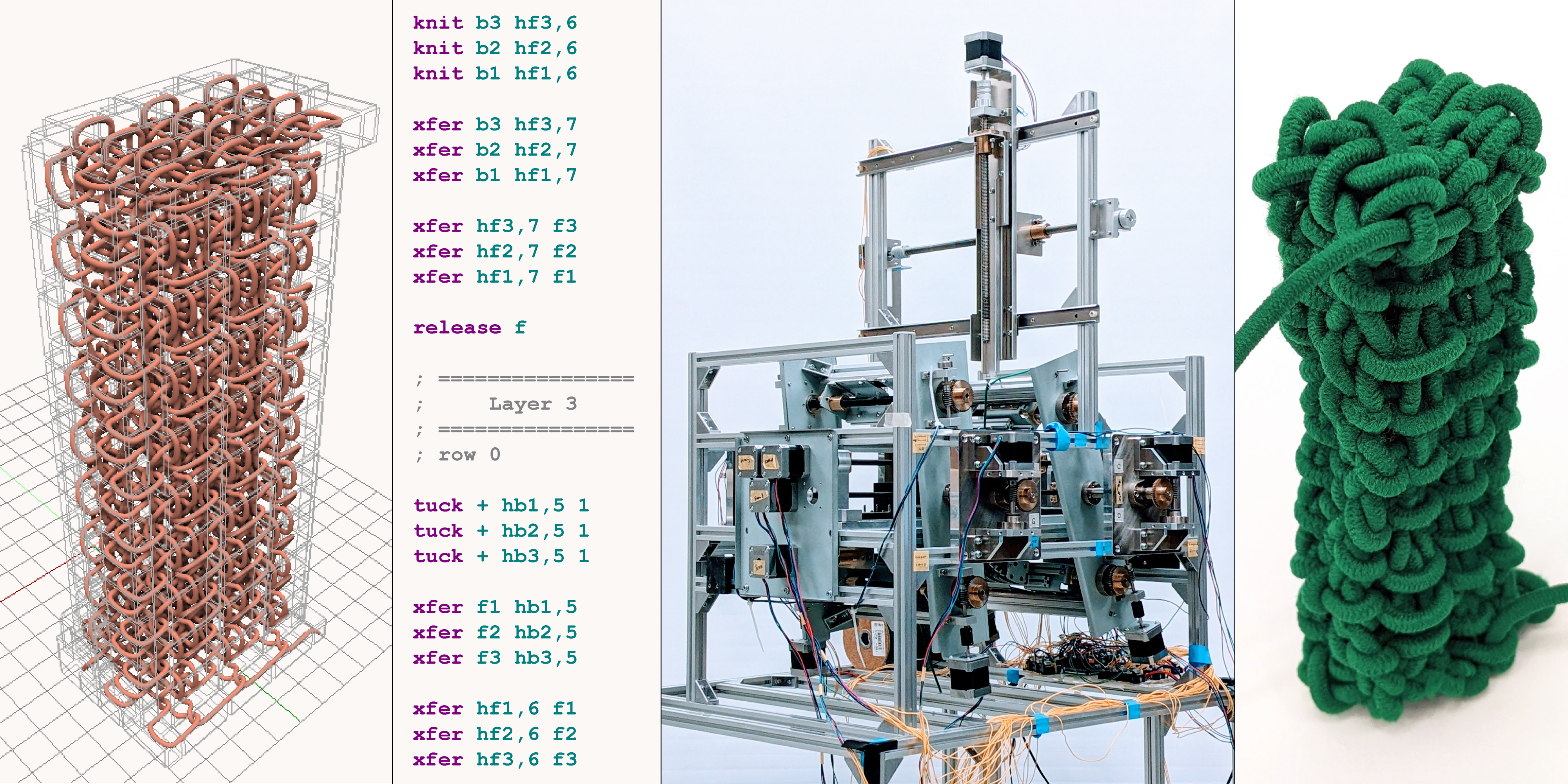 ソリッド編みは編み物なので、基本的に手作業で編み上げることができる。だが、中身まですべて編み込まれた立体的構造物を編み上げるには相当な時間と労力が必要になる。そのため、研究者たちはソリッド編みを自動化するため、専用の「ソリッド編み機」と編み上げパターンを設計する専用のコンピューター言語「Solid Knitout」を開発している。