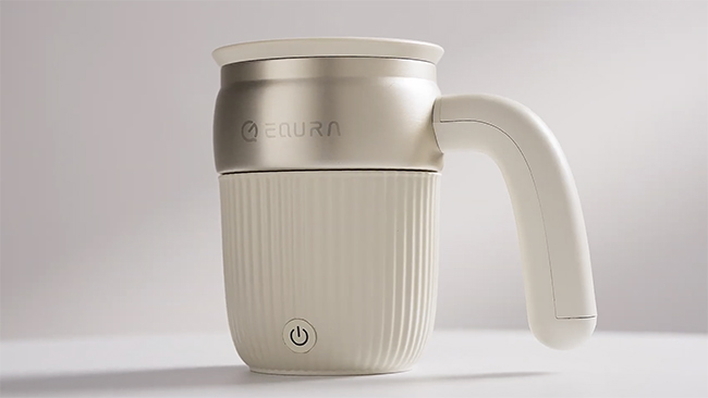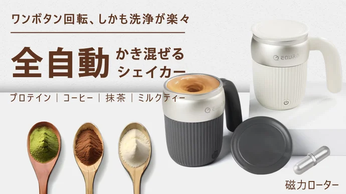 「equra」はボタンを押すだけで高速モーターが回転し、30秒後に自動停止。インスタントコーヒー、抹茶、プロテインドリンクなどの粉末ドリンク作りに最適だ。