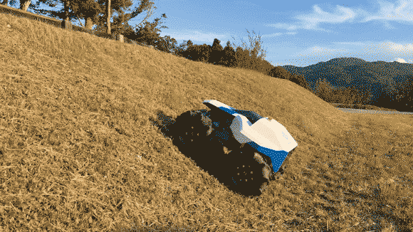 その場で旋回できるため狭い場所でも小回りが利き、不整地走行にも対応。全長1m強・幅65cm・重さ約80kgで、軽トラックで運搬できる。