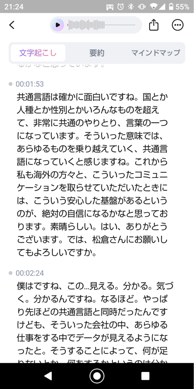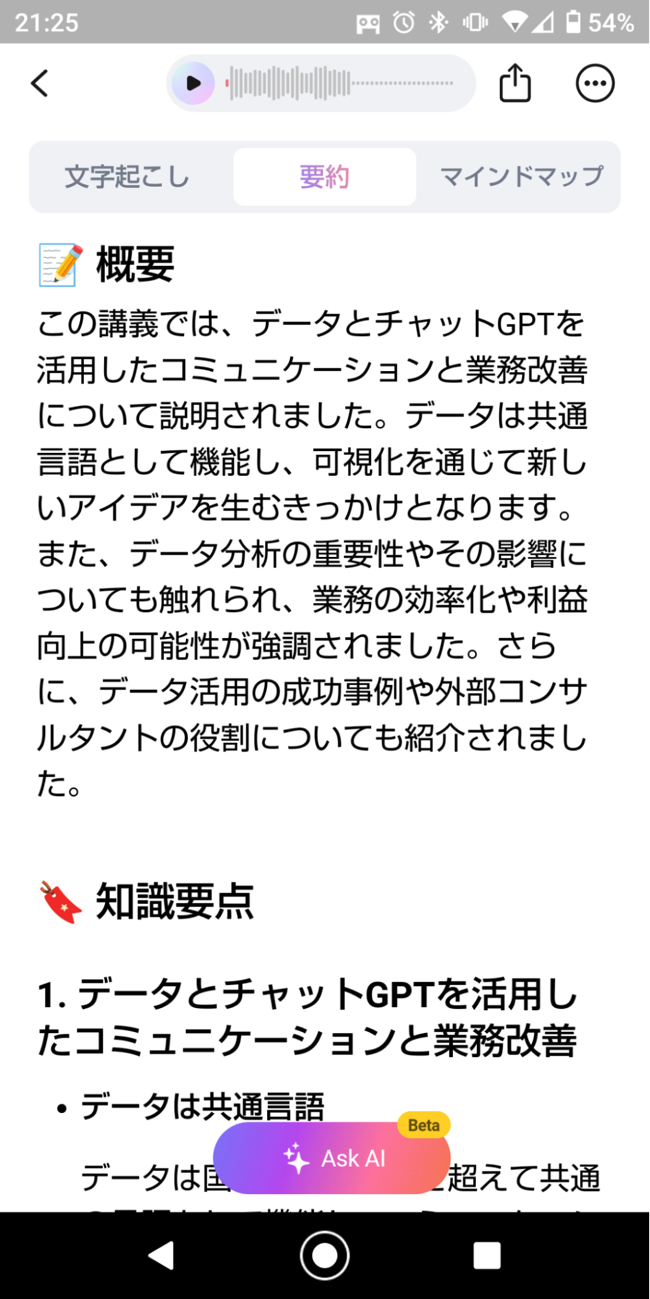 さらに打ち合わせの内容全体について、要約してくれます。こちらもアプリからボタン1発で自動的に作ってくれます。