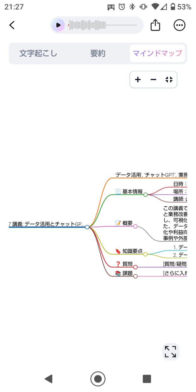 図解化する「マインドマップ」もアプリから簡単に生成できます。図にすることで、より内容が伝わりやすくなりますね。