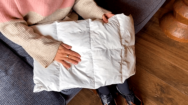「エアロゲルウルトラダウンマフラー」は、4層構造になっており、ナイロン、エアロゲル、アルミニウム層と中綿にホワイトダックダウンを使っている。