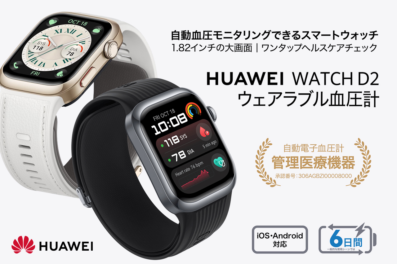「HUAWEI WATCH D2 」は、圧力センサー・ミニポンプ・膨張式カフを搭載し、着用すればいつでもどこでも血圧測定が可能なスマートウォッチだ。他にも複数のヘルスチェック機能を搭載。日本と欧州の医療機器認証を取得している。