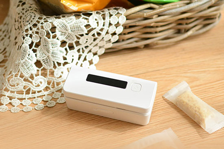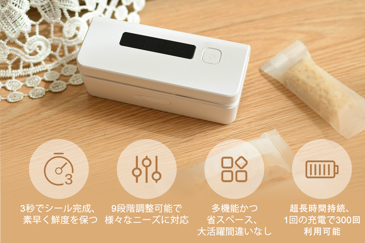 「HAKU009」は、熱と圧力で袋を密閉できるヒートシーラー。スナック菓子の再密閉や、食品の保存、小さい部品の個別保管などさまざな用途で使用できる。