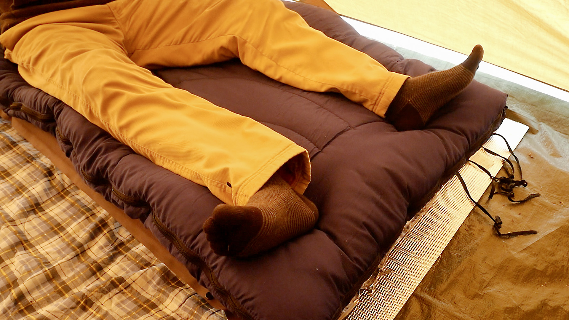 今回ご紹介する「ヒュッゲスリープ」は、ふっかふかの布団のような感覚でゆったり寝返りもできる冬用寝袋。サンプルをお借りして、実際に氷点下の夜に試用してみました。