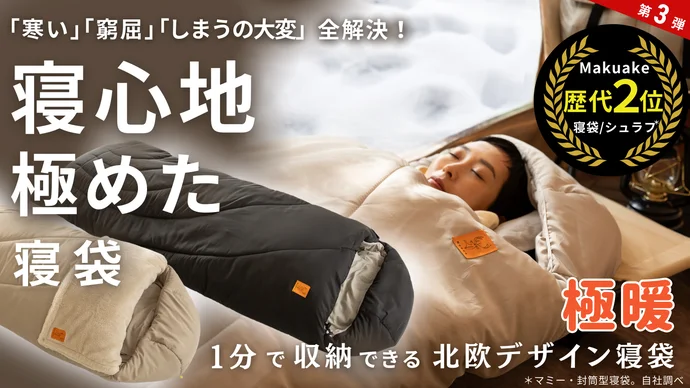 冬のキャンプ、皆さんはどんな寝袋を使用していますか?冬用シュラフといえばマミータイプが定番だと思いますが、窮屈で腰や背中が痛くなった経験もあるかと思います。
