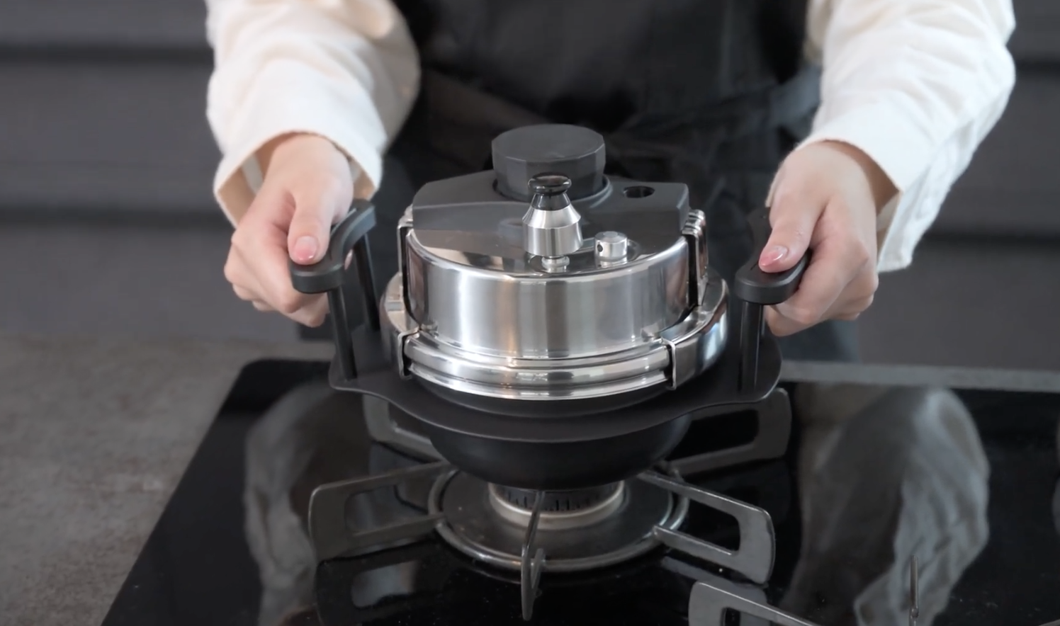 「早炊き名人」は、お米の浸水が不要。火に10分かけて、数分間蒸せば、約15分でご飯が炊けるという。加圧中は、蓋がロックされる仕組みにもなっており、安全性も確保されている。