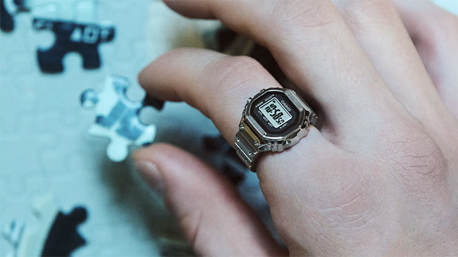「CRW-001-1JR」は、カシオが時計事業50周年を記念して開発したリングウォッチ。カシオ腕時計の複雑な造形が、指輪サイズのフルメタルデザインで細かく再現されているという。