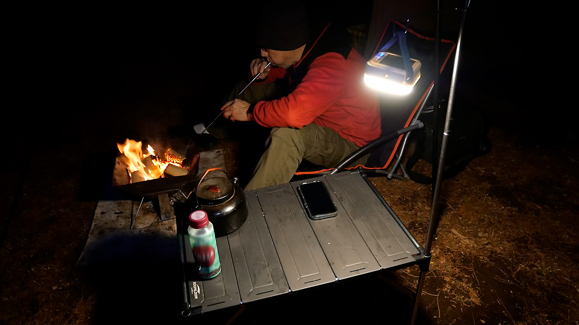 暗くなったらLEDランタンとして。最高1000ルーメンの3段階の明るさ調整と4種類の色温度切り替え。曲面デザインで広範囲に照らし出してくれるので、ソロキャンプならメインランタンとしても使えそうです。