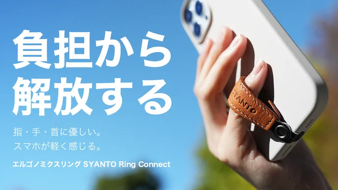 「SYANTO Ring Connect」は鍼灸師が人間工学に基づき考案したスマホリング。背面ではなく底面からぶら下がるリングに指を通す構造によって、使い心地が向上するという。