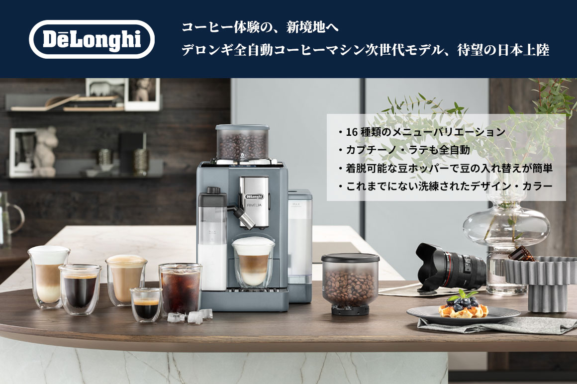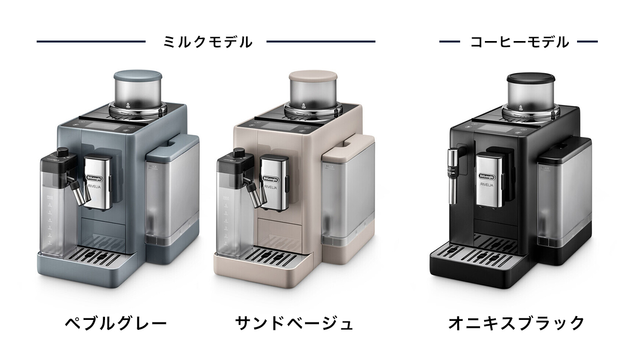 「Rivelia」は、16種類のメニューからボタン操作で本格的なコーヒーが楽しめるデロンギ製のコーヒーマシン。カプチーノやカフェラテなどミルクを使ったコーヒーが作れる「ミルクモデル」と、それらを含まない「コーヒーモデル」がある。