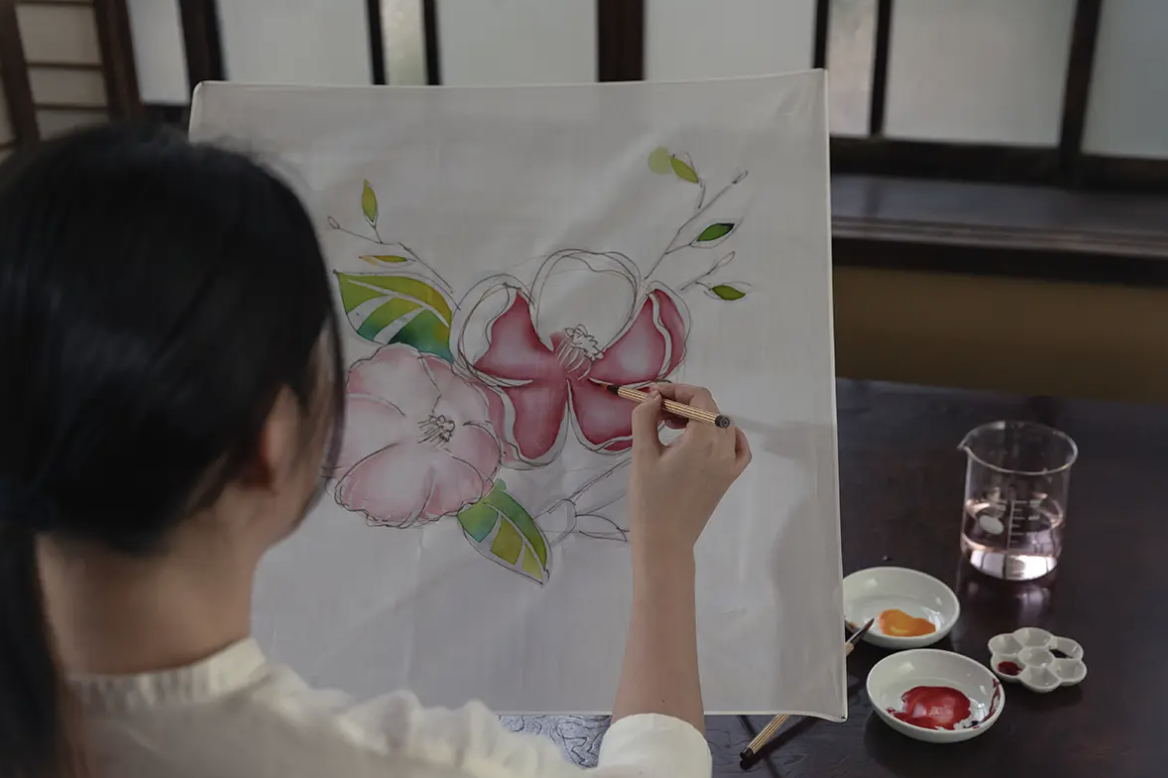 「ろうけつ染め」は、布に溶かしたろうで模様を描き、その上から染料を重ねて染める。布にろうを染みこませることで、染めない部分をコントロールする。これにより、ろうの割れや重なりで美しい模様が生まれるのが特徴だ。