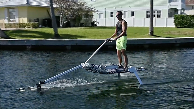 「HydroBlade」はカワサキモータースのジェットスキーをオマージュしたという1人乗り・スタンドアップ式のEV水中翼船。