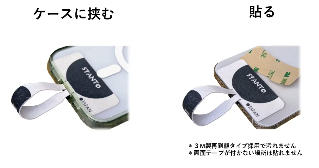 「SYANTO V3」は、挟む・貼るの2通りの取付方法に対応し、ケースの有無を問わず使用できる。重さはわずか2gで、端末を選ばない汎用性の高さも特徴だ。