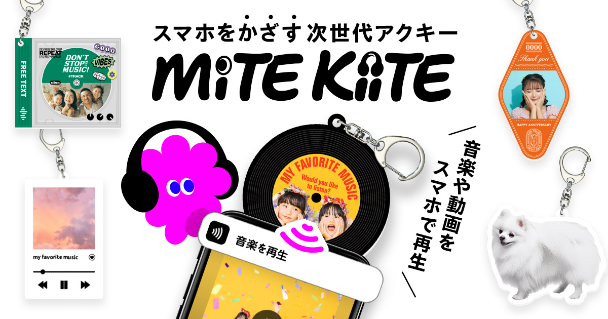 「MiTE KiiTE」は、ICチップ内蔵のアクリルキーホルダーを作成できるスマホアプリ。スマホをかざすと音楽や動画を再生できる。