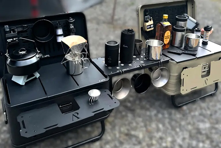 「APIL アルミギアボックス」は、ソロキャンプ用の多機能な収納ボックス。収納、テーブルなどを一体化し、キャンプギアの整理や調理スペースの確保など、さまざまな用途に対応する。